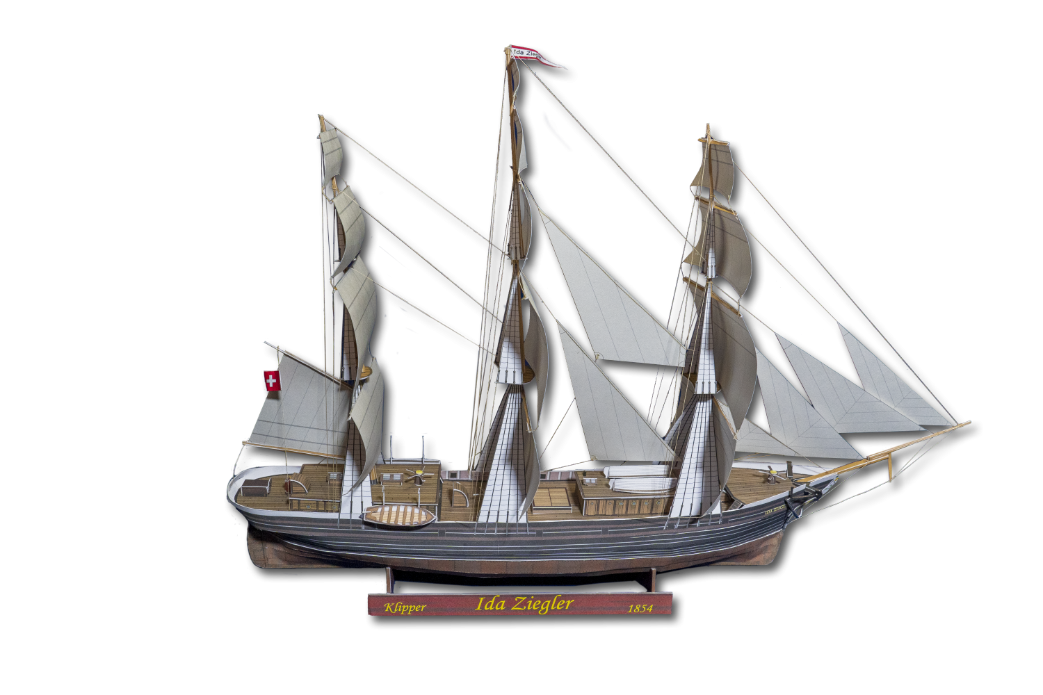 * WICHTIG: Dieses Modell ist sehr anspruchsvoll und nicht geeignet für Kinder der Unter- und Mittelstufe. Willkommen an Bord der «Ida Ziegler»! Sie ist «einer der schönsten Schiffskörper, die in neuer Zeit zusammengesetzt wurden» (Leipziger Illustrierte Dez. 1855). Die schnelle Winterthurerin war ein prachtvoller Klipper, der in knapp 90 Tagen die halbe Welt umsegeln konnte. Die Erstbesitzer waren die Winterthurer Kaufleute Georg Heinrich Biederman, Jakob und Andreas Biedermann, die Firma «Gebrüder Greuter & Rieter» sowie das Londoner Handelshaus «Wattenbach Heilgers & Co.». Benannt wurde das Schiff nach Ida Ziegler-Egg zum Lindengut, der 20-jährigen Tochter des Teilhabers Johann Ulrich Greuter-Egg. Am 12. Oktober 1854 startete die «Ida Ziegler» mit einer Salzladung zur Jungfernfahrt von Cadiz nach Calcutta. Sie bot 52 Passagieren Platz. Die Winterthurer massen dem Überseehandel in dieser Zeit groses Gewicht bei. Im Februar 1869 fanden die Handelsfahrten der «Ida Ziegler» ein abruptes Ende: Wegen eines Fehlers des Hafenmeisters strandete sie vor der Küste Neuseelands. |