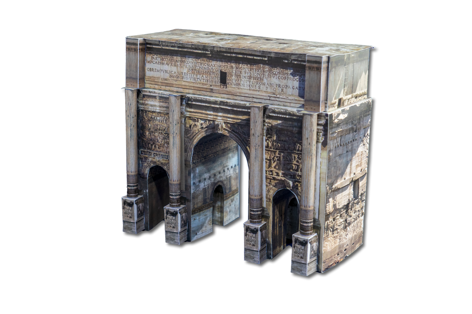Dieser Triumphbogen wurde zu Ehren des Kaisers und seiner Söhne Geta und Caracalla im Jahr 203 n. Chr. in Rom errichtet. Er ist ein Denkmal, das an den Sieg der römischen Truppen im Krieg gegen die Parther erinnern soll. Die Parther waren ein mächtiges und kriegerisches Volk an der Ostgrenze des Römischen Reiches. Sie hatten jahrhundertelang Streit mit den römischen Eroberern und fügten ihnen auch empfindliche Niederlagen zu. Die Siege von 195 und 198/199 n. Chr. werden durch eine grosse Inschrift festgehalten, die auf beiden Seiten der Attika eingemeisselt ist. Die Attika ist das oberste "Stockwerk" des Bogens. Sie dient als Sockel für die Aufstellung von Figuren und Vasen und zur Aufnahme von Inschriften und Reliefs. Die Inschrift blieb nicht lange im ursprünglichen Zustand: Ein Jahr nachdem der Kaiser gestorben war und sein Sohn Caracalla den Thron übernommen hatte, liess dieser den Namen seines Bruders Geta von der vierten Zeile der Inschrift entfernen und beschränkte dadurch den Ruhm auf sich und seinen Vater. Der Triumphbogen liegt am Forum Romanum. Ein "Forum" war in den Städten des Römischen Reiches der zentrale Hauptplatz; hier fand alles Wichtige und Entscheidende statt. Der Severusbogen mit seinen drei Toren wurde denn auch bewusst am Forum Romanum in Rom errichtet, und zwar am nordwestlichen Ende, wo der übliche Weg des römischen Triumphzugs durchging. Ein solcher Triumphzug führte immer über das Forum Romanum und endete beim Jupitertempel auf dem Kapitolhügel, wo das abschliessende Opfer stattfand. Der Triumphzug war gesäumt von einer riesigen Menschemenge, die den Sieger mit dem Jubelruf „Io triumphe!“ feierte. Voran schritten die Senatoren, Magistrate und Musiker. Der Triumphator fuhr auf einer Quadriga, einem zweirädrigen Streitwagen, der von vier Pferden gezogen wurde. Im Zug marschierten auch Kriegsgefangene mit, welche danach entweder hingerichtet oder versklavt wurden. Ferner Das Monument ist 20.88m hoch, 23.37m breit und 11.20m tief; es ist mit Marmor verkleidet. Ursprünglich stand zuoberst auf dem Bogen eine Bronzestatue, die einen von sechs Pferden gezogenen Triumphwagen darstellte mit Kaiser Septimius Severus und seinen beiden Söhnen Caracalla und Geta als Lenker. Dieser Aufsatz ist irgendwann entfernt worden, aber auf alten Münzen kann man ihn noch erkennen. Bestimmt ist dir der reiche Bildhauerschmuck des Bogens aufgefallen; dieser erzählt von den Hauptereignissen der Feldzüge gegen die Parther. Du kannst Szenen erkennen, in denen Septimius, von der Rednerbühne aus, sich an seine Soldaten wendet. Du siehst, wie die Römer feindliche Städte mit einem Sturmbock bedrängen und die Parther sich mit ausgestreckten Händen ergeben oder auf Pferden ins Hochland fliehen. Über dem Mittelbogen werden geflügelte Siegesgöttinnen mit Kriegsbeutestücken dargestellt sowie Figuren, welche die Jahreszeiten verkörpern. Der zentrale Stein wird von einer Statue des römischen Kriegsgottes Mars gekrönt. Über den Seitenbogen sind Flussgötter abgebildet. Die Sockelskulpturen zeigen die gefangenen Parther. |