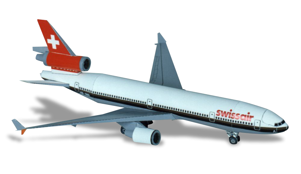 Das Nachfolgemodell der Swissair-DC-10 heisst MD-11. Der MD-11 «Swissair-Jet» ist ein Passagierflugzeug für den Langstreckenverkehr. Die MD-11 war seit 1991 im Einsatz der ehemaligen schweizerischen Luftgesellschaft Swissair und ermöglichte eine nahtlose Ablösung der DC-10. Die MD-11 verfügt über rund 240 Plätze (20 mehr als die DC-10) und 20 Tonnen Frachtkapazität sowie eine Reichweite von 9'300 Kilometern bei voller Nutzlast. Dieses Flugzeug ist eine Weiterentwicklung der bewährten DC-10, von der seit 1971 über 370 Einheiten für den zivilen Luftverkehr gebaut worden sind. Im Vergleich zur DC-10 verfügt die MD-11 über einen 5,7 Meter längeren Rumpf, sogenannte Flügelspitzenzäune (Winglets) sowie einen zusätzlichen Tank im Höhenleitwerk. Letzterer erhöht nicht nur die Treibstoffkapazität und damit die Reichweite, sondern erlaubt - verbunden mit einer automatischen Pumpverbindung zu den Flügeltanks - die Optimierung der Schwerpunktlage. Die Summe aller Massnahmen ermöglicht zusammen mit den verbesserten Triebwerken eine Treibstoffeinsparung von mehr als 30 Prozent. Das Cockpit wurde modernisiert (Bildschirme) und für eine Bedienung durch zwei Piloten ausgelegt. Die Kabine weist den bekannt guten Komfortstandard der alten DC-10 auf. Die Einrichtungen wurden bereits damals so ausgelegt, dass relativ einfach und rasch Sitzanordnungen verändert werden konnten. Dank des verlängerten Rumpfes beträgt die Frachtkapazität über 20 Tonnen. Die MD-11 wird von drei Triebwerken vom Typ PW4000 (Pratt & Whitney) angetrieben. Technische Daten: |