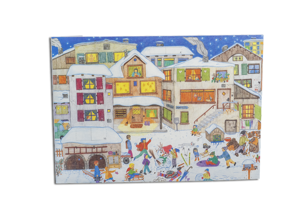Du siehst vor dir ein buntes Winterbild. Wir befinden uns in einem verschneiten Städtchen, der Schnee lastet auf den Hausdächern. Auf dem Platz im Vordergrund spielen viele Kinder. Sie schlitteln, bauen einen Schneemann und springen umher. Ein bärtiger Mann mit Zipfelmütze hackt Holz. Vögel picken am Futterbrett. Eine Katze rennt einem Schneeball nach.